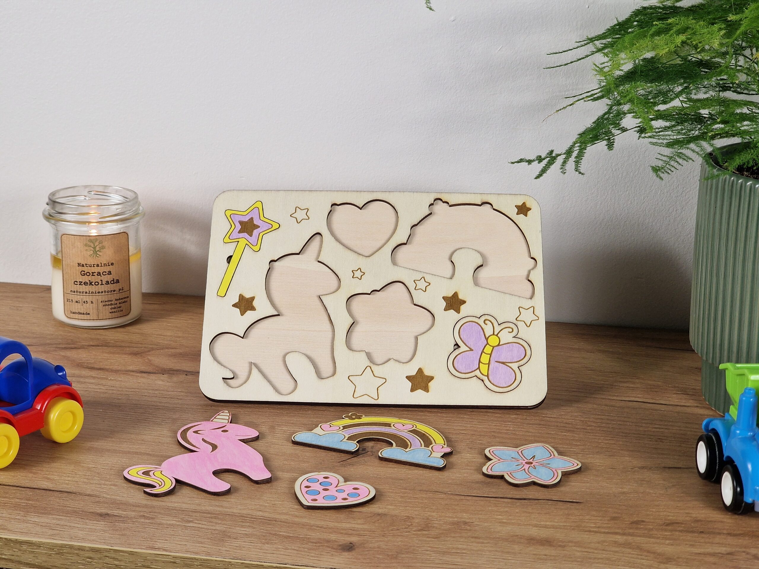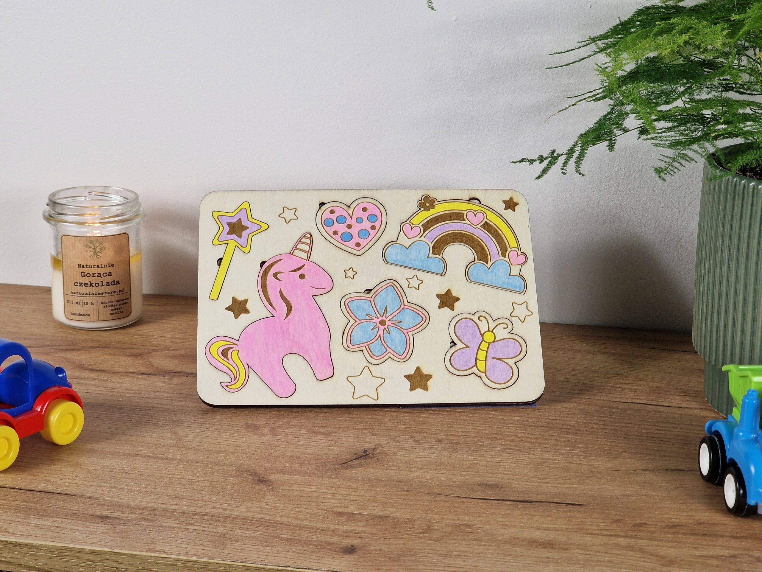 Tabliczka edukacyjna „Baśniowa Kraina” to wyjątkowy produkt wykonany z naturalnej sklejki, stworzony z myślą o rozwoju, które uwielbiają kreatywną zabawę i baśniowe motywy. Delikatne grawerunki przedstawiające jednorożca, tęczę i motyla przenoszą malucha w magiczny świat, pobudzając wyobraźnię oraz wspierając rozwój poznawczy.