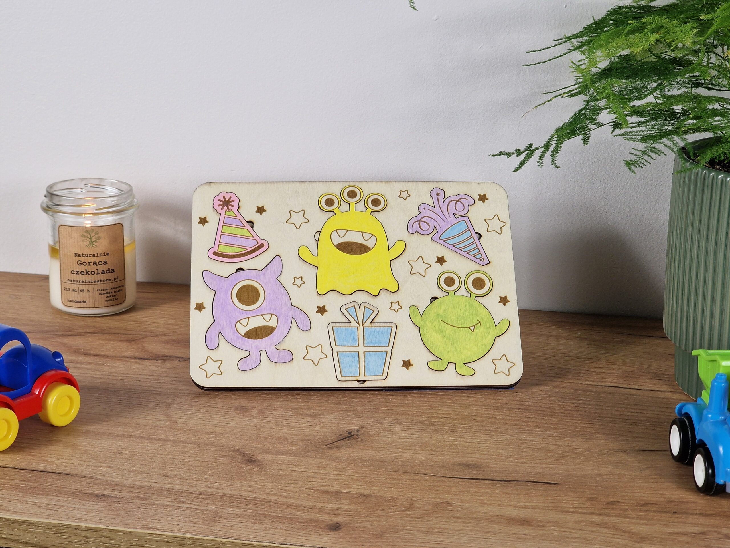 Tabliczka edukacyjna „Kosmiczne Przyjęcie” to oryginalna pomoc edukacyjna wykonana z naturalnej, ekologicznej sklejki brzozowej. Przedstawia zabawne ilustracje kosmitów w czapkach imprezowych, urodzinowego tortu i prezentów – wszystko w kosmicznej, radosnej oprawie.