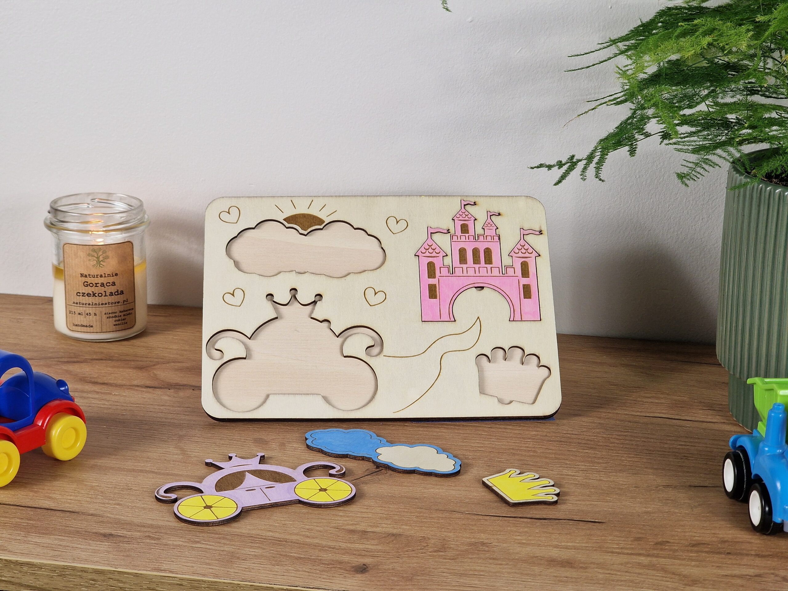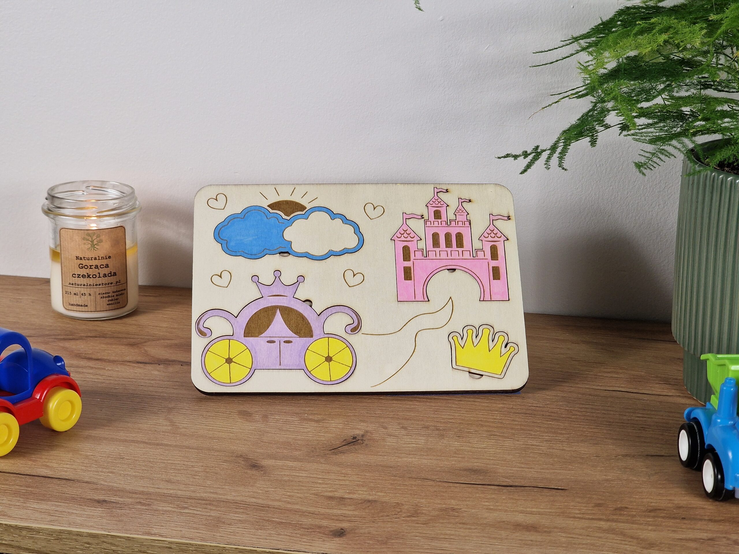 Tabliczka edukacyjna „Kraina Księżniczek” to estetyczna i funkcjonalna zabawka wykonana z naturalnej sklejki brzozowej. Na powierzchni tabliczki znajdują się grawerowane elementy: karoca, korona i tęcza – wszystko w baśniowym, królewskim klimacie. To połączenie nauki i zabawy w wyjątkowo magicznej formie.