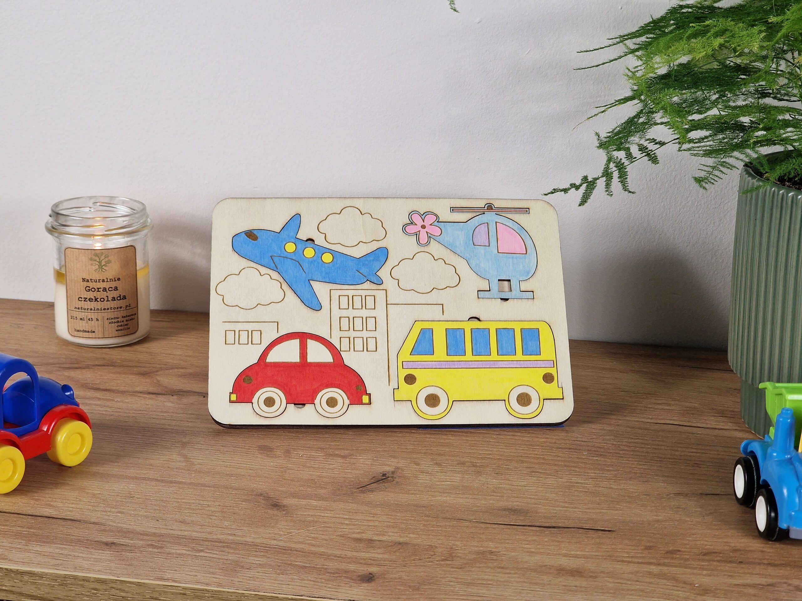 Tabliczka edukacyjna „Miejskie Pojazdy” to ręcznie wykonany produkt z naturalnej sklejki brzozowej, który łączy funkcję edukacyjną z estetyczną formą. Zawiera precyzyjnie wygrawerowane ilustracje samolotu, helikoptera, autobusu oraz auta – idealne do nauki nazw pojazdów i rozwijania zainteresowań motoryzacją oraz transportem miejskim.