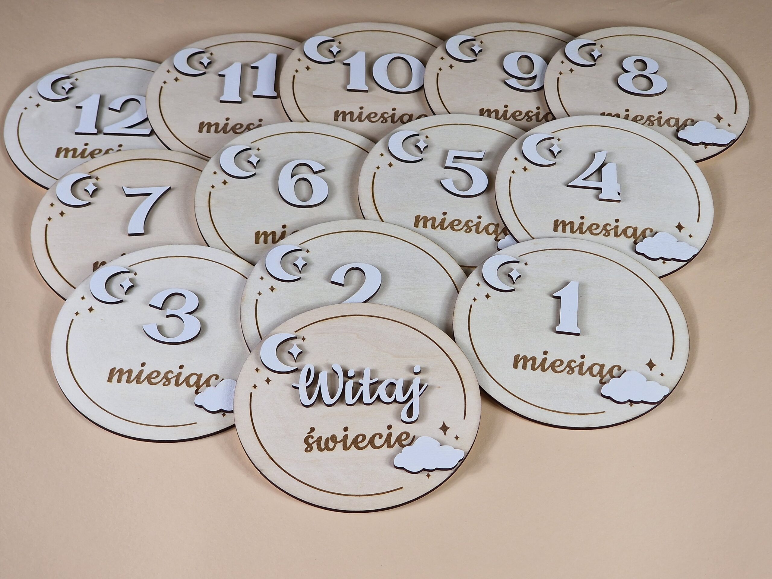 Tabliczki do zdjęć z miesiącami prezent na pierwszy rok życia dziecka – księżyc z chmurką